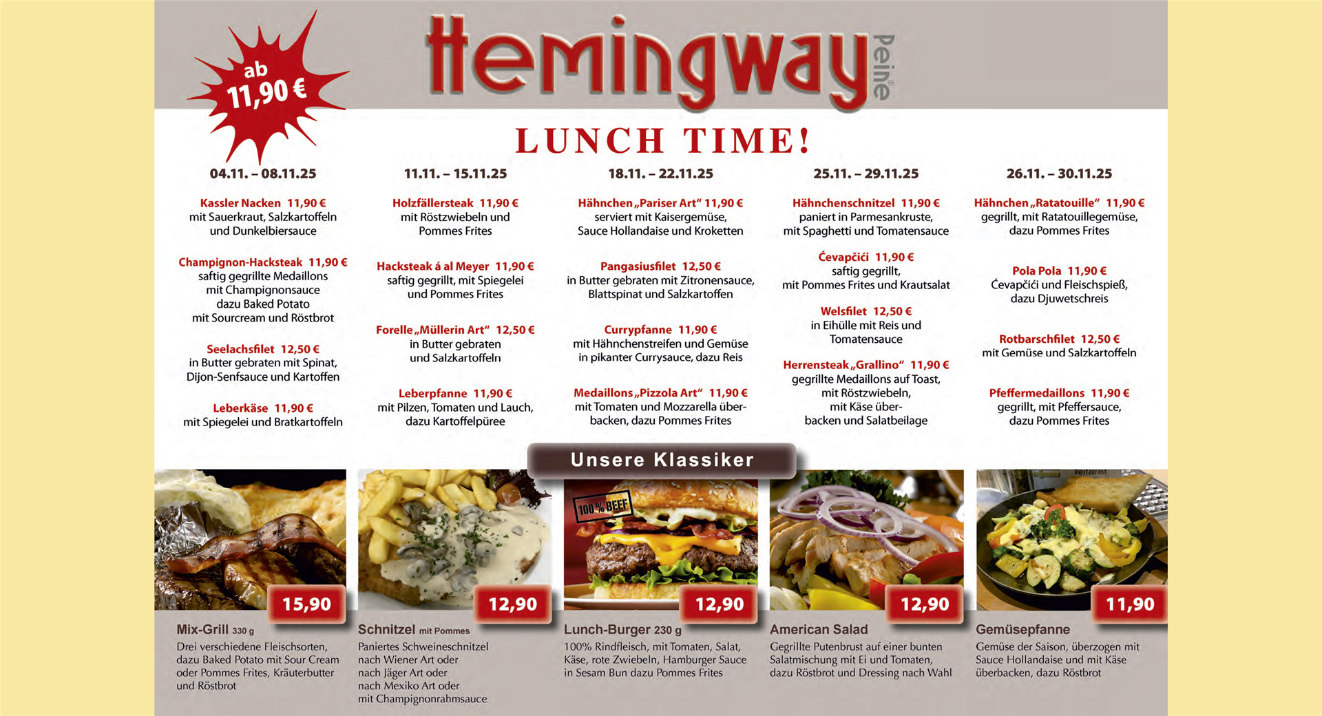Lecker und günstig essen von Montag bis Samstag von 11:30 Uhr bis 14:30 Uhr, ausgenommen an Feiertagen.
